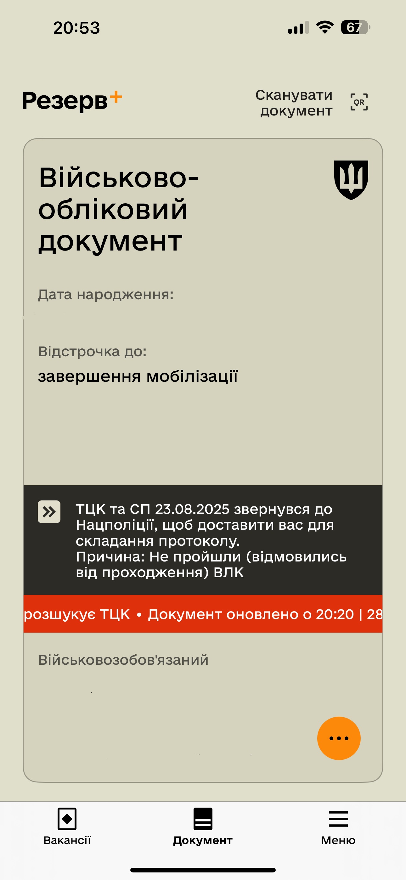 Возникла новая проблема:15.07.2025 пришло в резерве уведомление: оплатить штраф в приложении, у вас есть 20 дней за то что не уточнили данные. Муж нажал в резерве на строку: штрафы онлайн и далее нажал на кнопку "начать" после чего пришло уведомление, что заявка какая-то отправлена. Через месяц 23.08.2025 в резерве уже пришло уведомление, что вас разыскивает ТЦК. А 28.08.2025 после обновления документа уже появилась красная строка что на фото, что мужа разыскивает тцк еще и причина не прохождение ВЛК направление на которое ему вообще не давали и он ничего не подписывал и в почте никаких писем от ТЦК нет. У мужа отсрочка в связи с поступление в ВУЗ, первый год обучения прошел, осталось еще 3 года учиться. Единственный раз, когда муж приходил в ТЦК это перед получением первой отсрочки, он тогда предоставил ТЦК электронный военный билет, ему дали отсрочку, но со словами: а где ваш бумажный военник книжка? У мужа на самом деле нет этого военного книжки у него еще приписное и этот комиссар сказал в следующий раз прийти и принести приписное, пройти ВЛК и получить книжку военный билет. Но муж так и не появлялся более в ТЦК и в течении года отсрочку обновлял по резерву и там все четко работало. И вот только сейчас появилась эта красная строка спустя месяц после уведомления про штраф, притом по причине влк почему-то а не штрафа. Что посоветуете делать? как это исправить без визита в ТЦК? И еще вопрос: когда отсрочка закончится при обновлении резерв продлит ее или из-за красной строчки уже отсрочку не выдаст? Была ли у вас практика подобного?