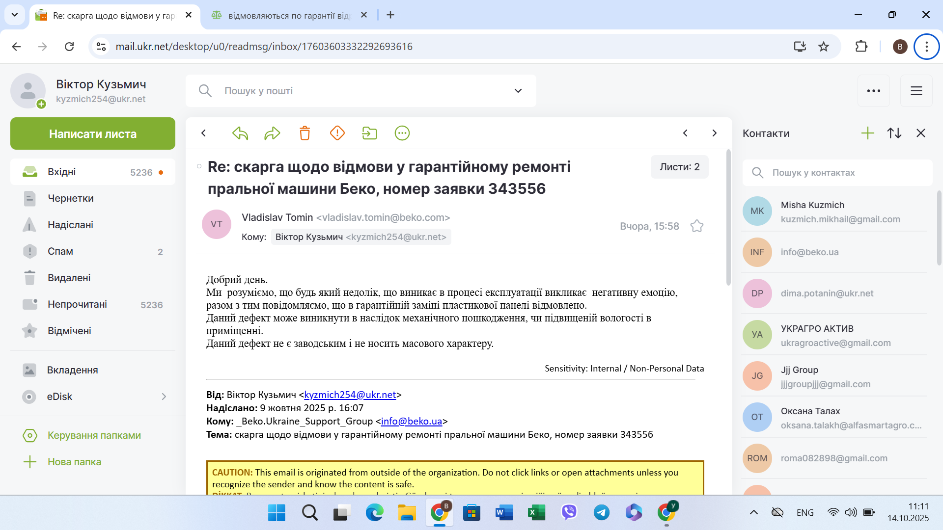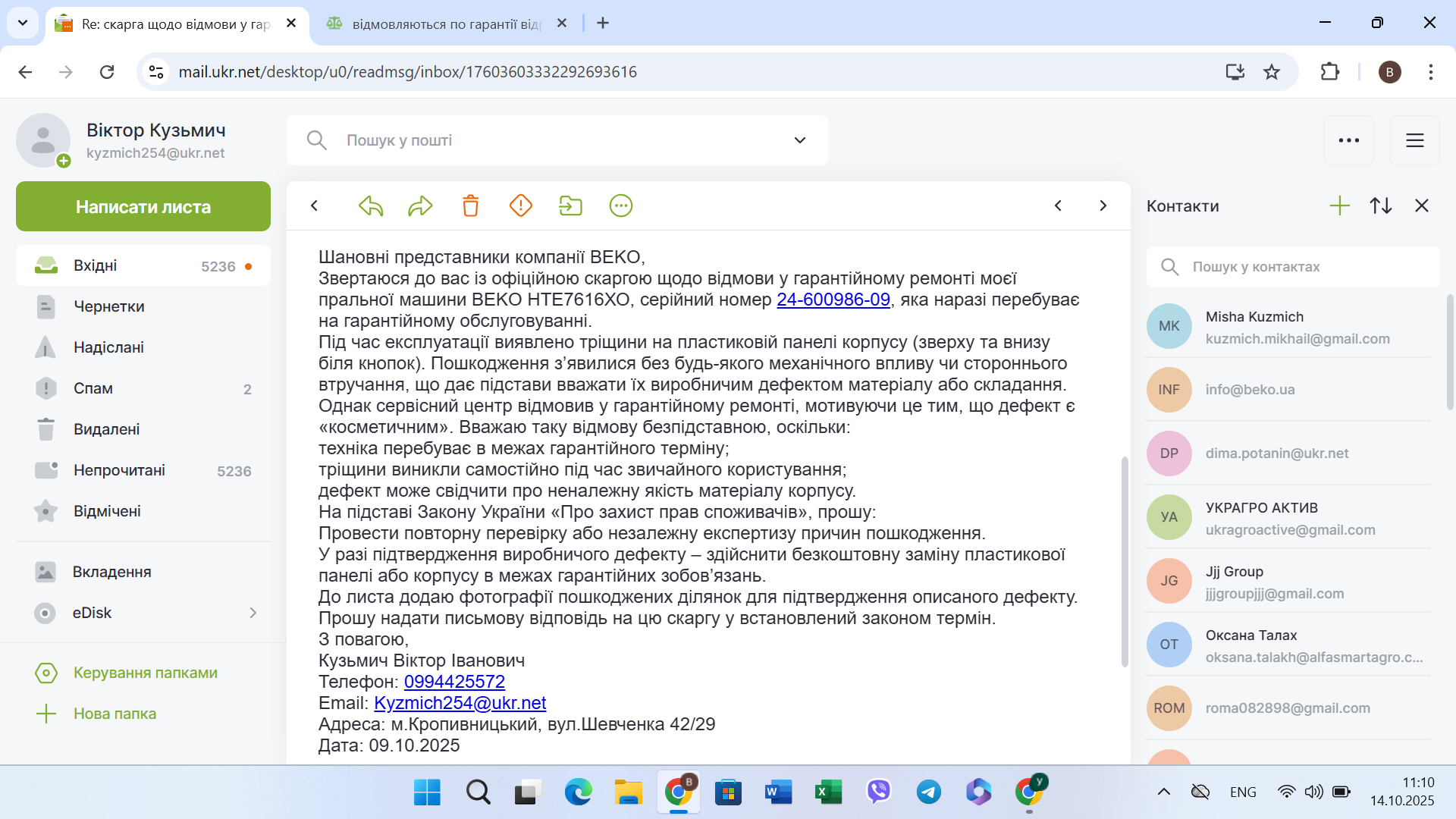 є фото, можу пізніше добавити якщо потрібно, і переписка з компанією Беко.