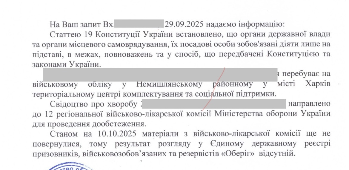 Дякую за відповідь! Але ж не зрозуміло, чому районна відповідає: Свідоцтво про хворобу … від 11.07.2025 направлено до 12 регіональної військово-лікарської комісії Міністерства оборони України для проведення дообстеження.Станом на 10.10.2025 матеріали з військово-лікарської комісії ще не повернулися, тому результат розгляду у Єдиному державному реєстрі призовників, військовозобовʼязаних та резервістів «Оберіг» відсутній.