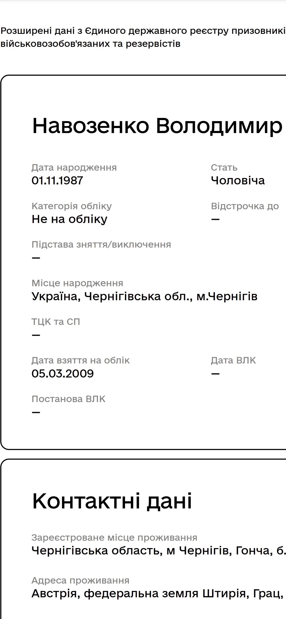 Я пам'ятаю що ставав на облік у місті Чернігові. Потім у Харкові, коли навчався протягом одного року. Потім знявся з обліку у Харкові та повернувся у Чернігов і тільки зробив тільки прописку. Ставав я на облік в Чернігові знову, вже не пам'ятаю.