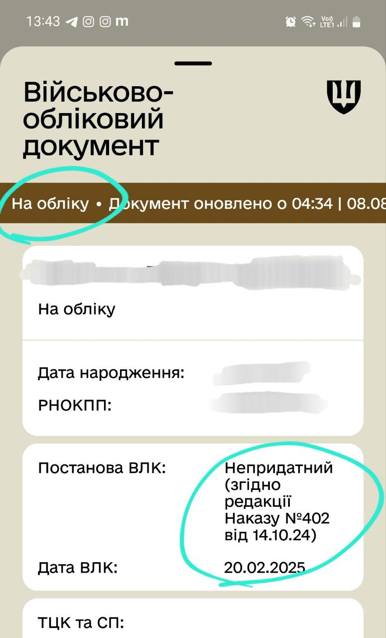 Вітаю, шановні юристи! Потрібна ваша правова допомога. Я пройшов ВЛК у грудні 2024 року у позаштатному ВЛК м. Києва, за результатами пройденого ВЛК було визнано непридатним до ВС. Свідоцтво про хворобу було направлено на затвердження до штатної ВЛК (для Києва - ЦВЛК). В Резерв+ досі у статусі обмежено-придатного, через це мене декілька разів подавали у "розшук". Я не погоджувався та зрештою все ж таки отримував постанови про закриття адмін провадження в зв'язку з тим, що ВЛК я все ж пройшов вчасно (додавав відповіді на масиви запитів від урядового центру та позаштатної влк, що свідоцвтво на затвердженні...).