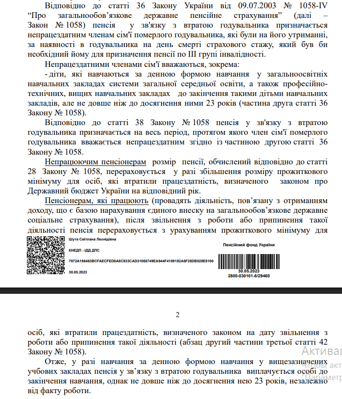 Так, у разі навчання за денною формою пенсія у зв’язку з втратою годувальника виплачуватиметься сину до закінчення навчання, однак не довше ніж до досягнення нею 23 років, незалежно від факту працевлаштування.