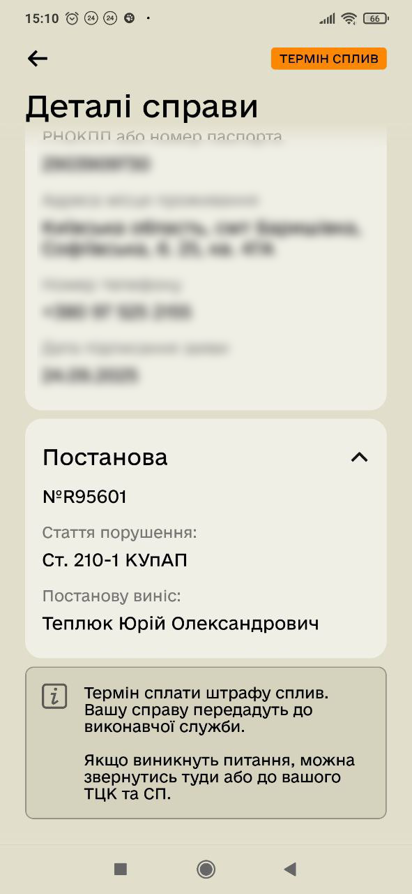 28.01.26 отримав в Резерв+ нове сповіщення, що "Вас розшукує ТЦК та СП", а на наступний день отримав в тому ж Резерв+ інформацію, що час для сплати штрафу сплив і справу передадать в виконачу службу. Постанова №R95601. Стаття: 210-1 КупАП. Постанову виніс: Теплюк Ю.О. Броварський РЦК та СП.