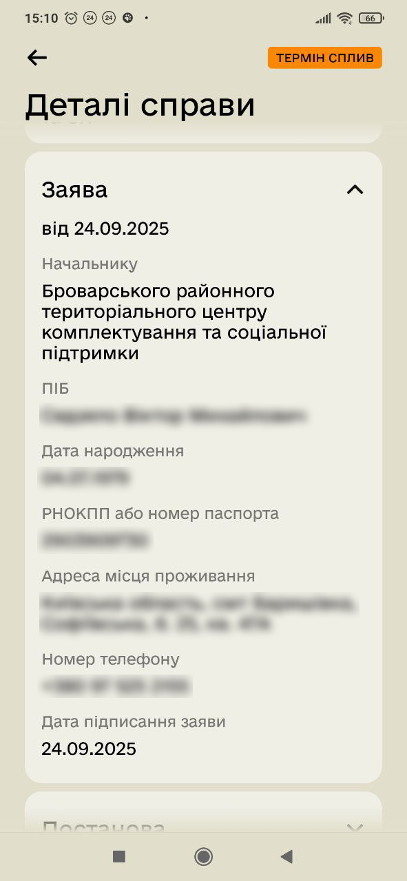 Є дата заяви в Резерв+ начальнику Броварського РЦК і СП від 25.09.25. А про постанову це вся інформація, яка є в Резерв+