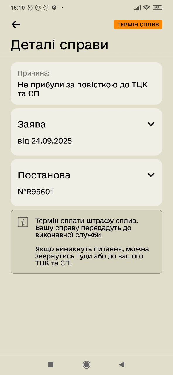 11.09.25 в Резерв+ прийшло сповіщення, що Виявлено порушення військового обліку... Подали в розшук. Була можливість сплатити штраф 50%, подав заявку про сплату штрафу (була мета сплатити штраф, аби не бути в розшуку). Але заявка зависла в статусі "Заява в роботі", і була в такому статусі довго десь до середини січня.