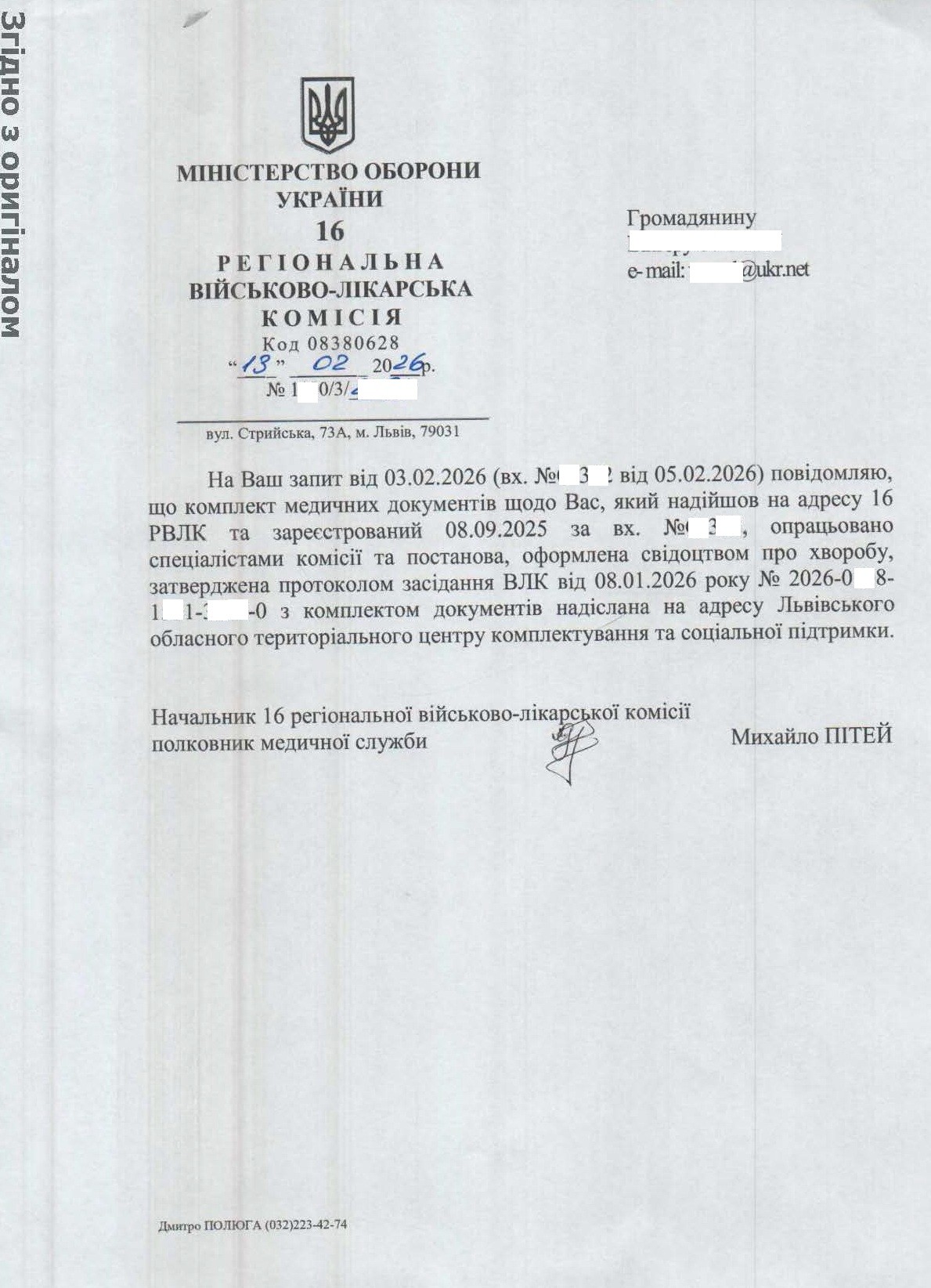 Ось для прикладу отримавши наш запит від 03.02.2026 р., 16-та регіональна ВЛК вже через 10 календарних днів надала нам відповідь, хоча могла б і причепитися до чогось або взагалі проігнорувати.